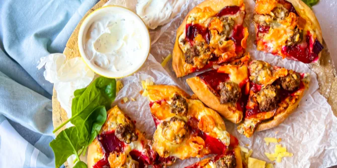 Assemble the pizza by adding a layer of the super thick mix, followed by a layer of grated cheese, add the sliced beetroot and carrot, top with 3 meatballs and finish with more grated cheese.