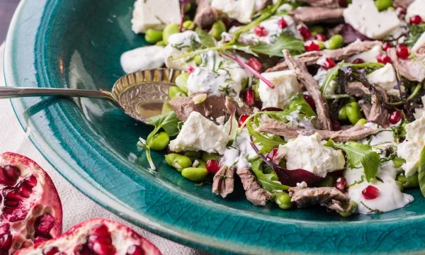 Place the shredded lamb in a serving dish and then scatter over the pomegranate seeds. Crumble over the feta and then add the broad beans.